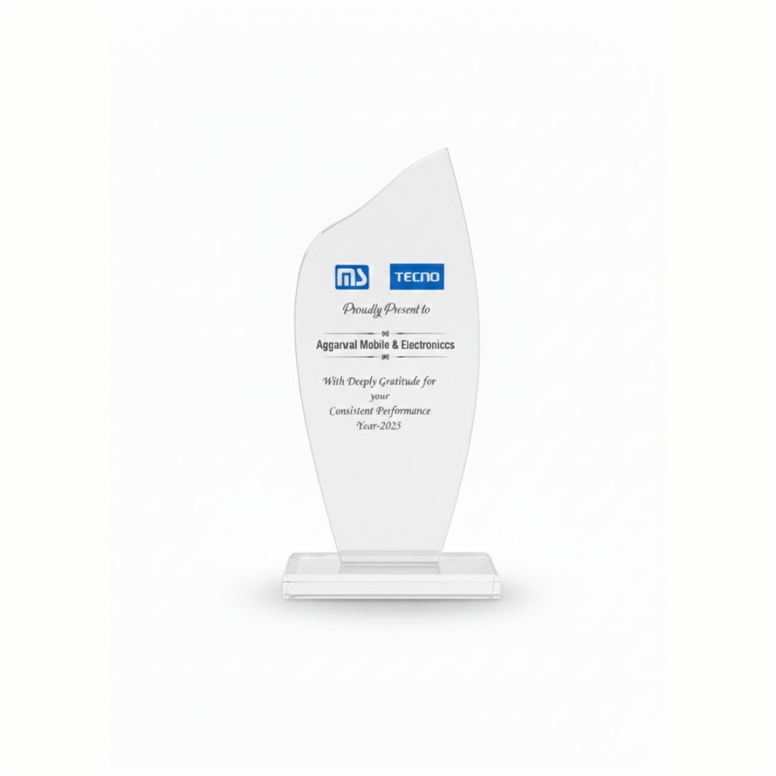 The award stands 5×8 inches tall and sits on a solid, clear rectangular base for a clean and modern look. Its smooth surface provides the perfect canvas for your custom logos and personalized messages. We use high-quality printing to ensure every detail of your brand looks sharp. This design works exceptionally well for honoring mobile retailers, electronics dealers, or any top-performing business partners.